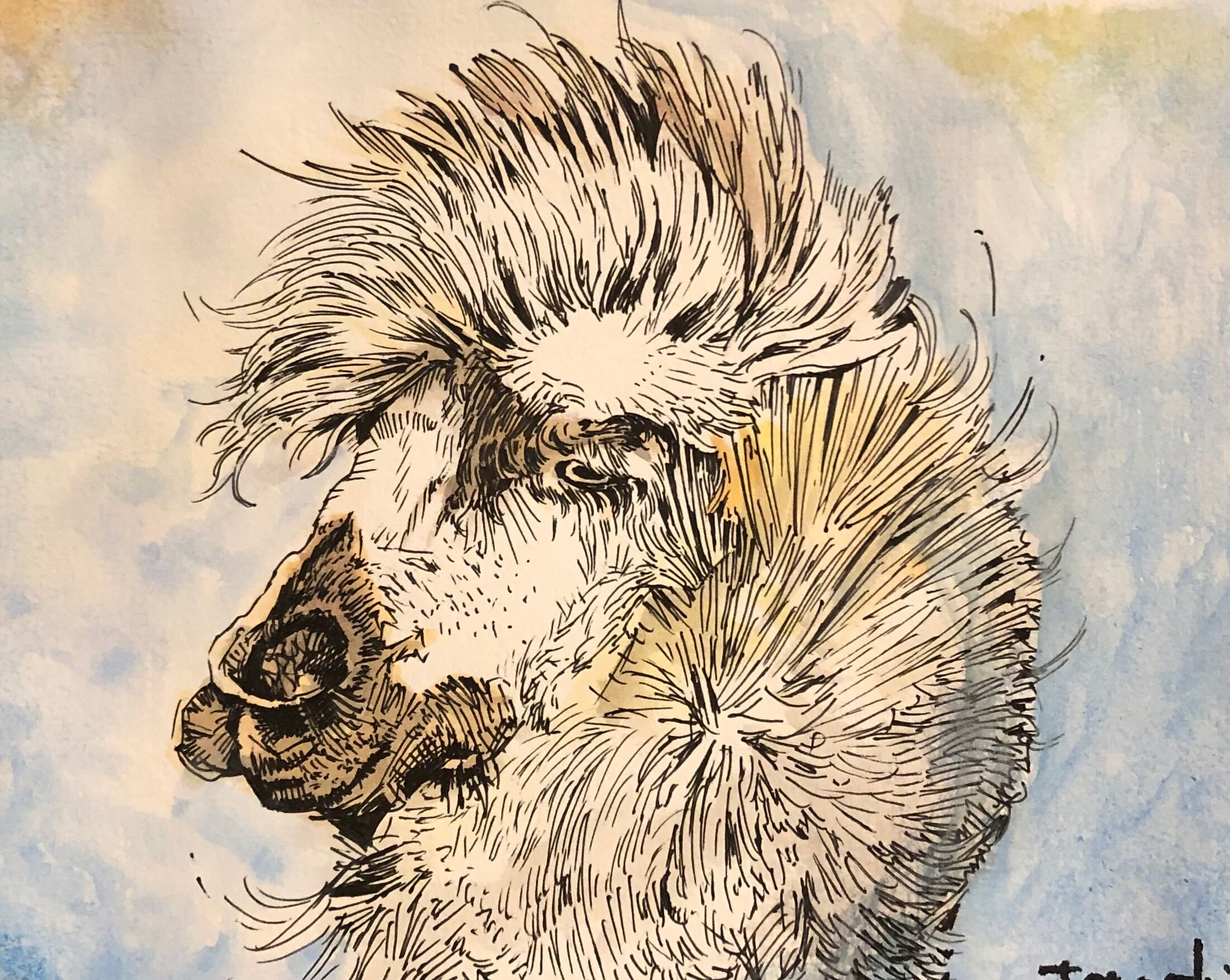 アルパカ(強風)。 ■原画 ■F1(220×160mm)サイズ画用紙。 ■アクリルガッシュ、水彩 額なし。クリアファイルに入れて郵送いたします。